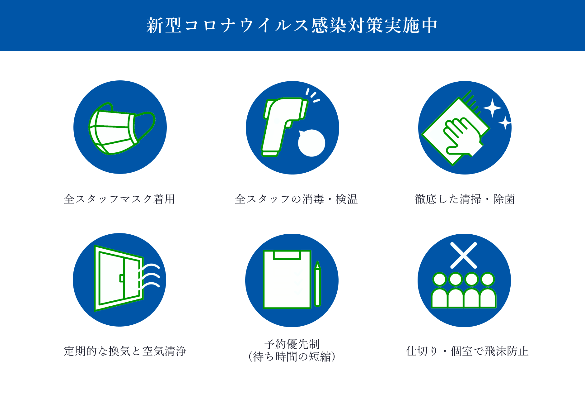 ランウドという30分に1回の院内清掃を起点に、オープン、クローズ時は院外などの細かな清掃も行なっています。ベッドは消毒、殺菌し、毎回新しいフェイスペーパーを使用しています。患者様が快適に利用できる環境作りに努めて参ります。